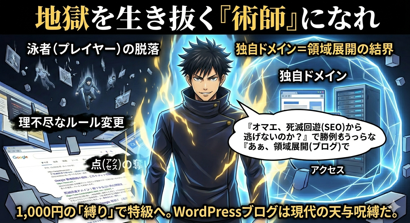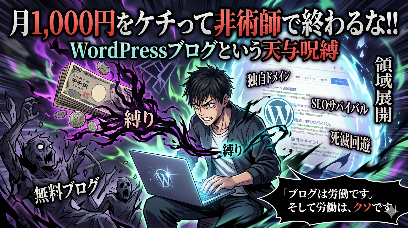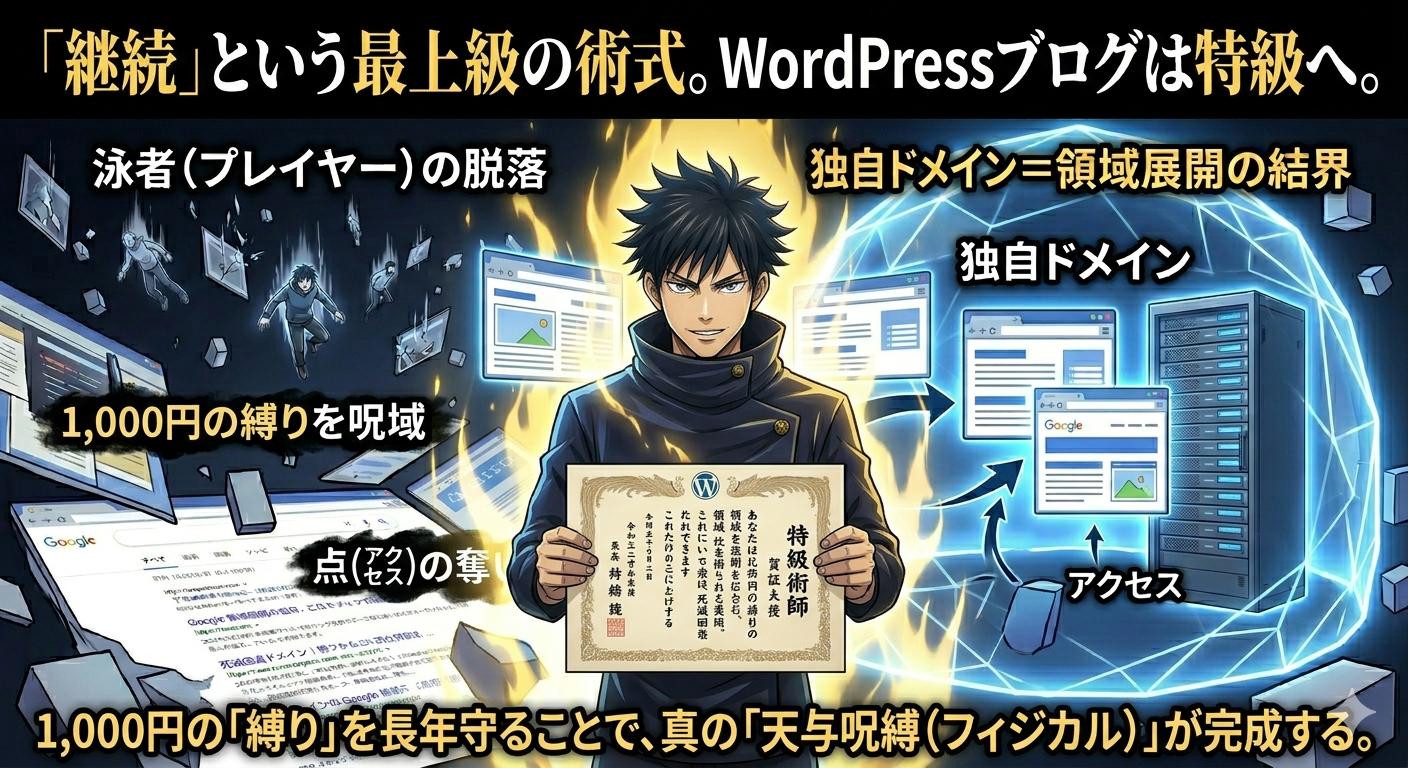 無料ブログで妥協するのは、呪力を持たずに呪霊に立ち向かうようなもの。無謀であり、合理的ではありません。月々1,000円のサーバー代という「代償」を払い、WordPressという天与呪縛(圧倒的フィジカル)を手に入れる。