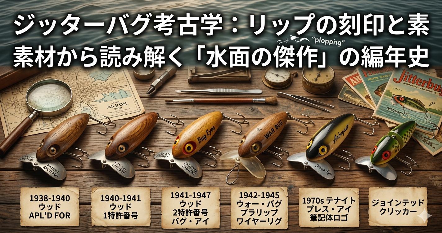 ジッターバグの製造年代を特定するには、リップの刻印、ボディ素材、目のデザインの3点をクロスチェックすることが重要です。