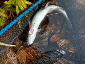 派手なカラーで視認性が高く、キビキビとよく泳ぐため、当然のように釣れます。ただ、心なしか魚からの「お触り(バイト)」が多いのは気のせいでしょうか(笑)。結局、昼まで投げ倒しましたが、記録更新となるサイズは出ず、無事に大会終了となりました。