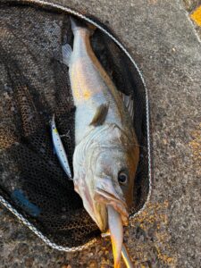 日の出とともにキャストを開始すると、数投でヒット! 朝日を浴びて暴れる、コンディション抜群のシーバスをキャッチしました。驚いたのは、口の中から20センチほどのコノシロがはみ出していたこと(笑)。コノシロを食った直後に私のルアーにも食いついてきたようで、なんとも食いしん坊な1匹で幸先の良いスタートが切れました。