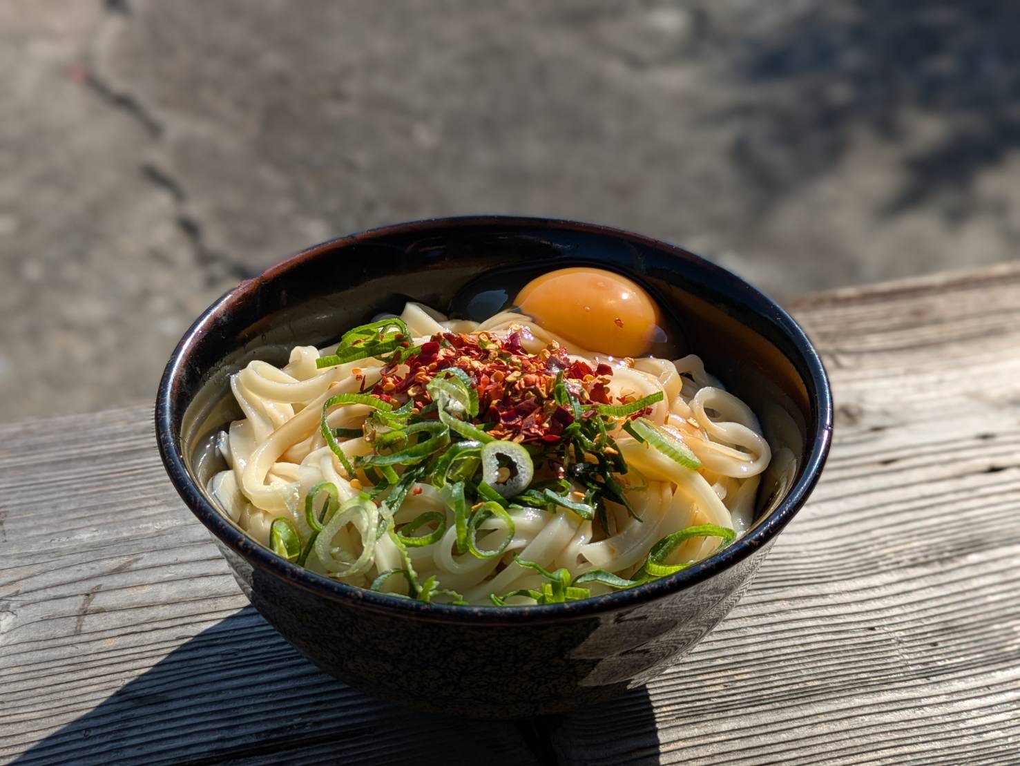 大会後の楽しみといえば、いつもの「三嶋うどん」です。 注文するのはもちろん「特大」。茹でたてを受け取ったら、冷めないうちに生卵をどんぶりの底へ。赤唐辛子、ネギ、お酢をサッとかけて少し蒸らします。